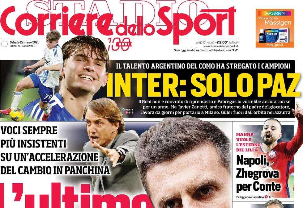 Il Corriere dello Sport, nella sua edizione odierna, continua a parlare dell'interesse dell'Inter per Nico Paz: talento argentino che ora milita nel Como di Cesc Fabregas il quale vorrebbe tenerlo almeno un altro anno, "Inter, c'è solo Paz" la prima pagina.