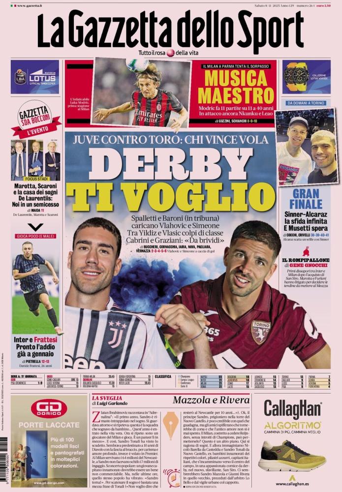 "Derby, ti voglio". Si apre così la prima pagina della Gazzetta dello Sport, che si espone però sull'addio di Davide Frattesi all'Inter: separazione pronta a gennaio. Il Corriere dello Sport apre con l'intervista a Gianpiero Ventura, molto polemico: "Col VAR avrei vinto più derby". infine Tuttosport, che si espone così: "Sa di derby". Di seguito le prime pagine di oggi, sabato 8 novembre.