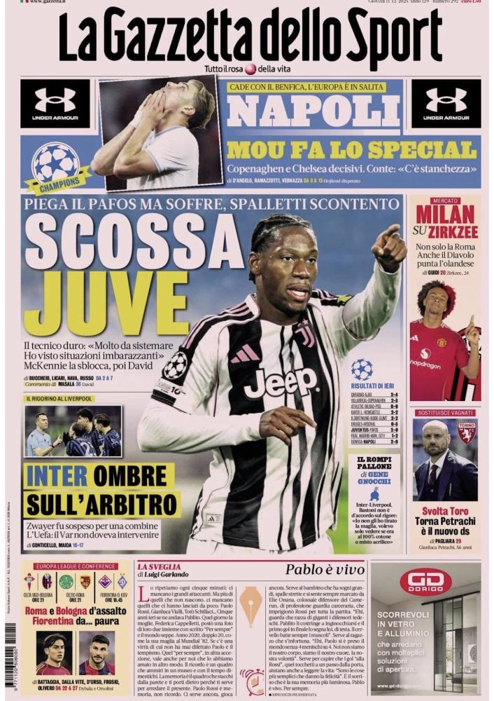 "Inter, ombre sull'arbitro. Napoli, Mou fa lo special. Scossa Juve", la prima pagina de La Gazzetta dello Sport.