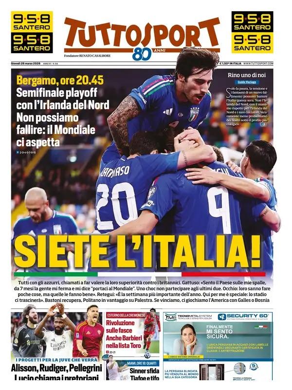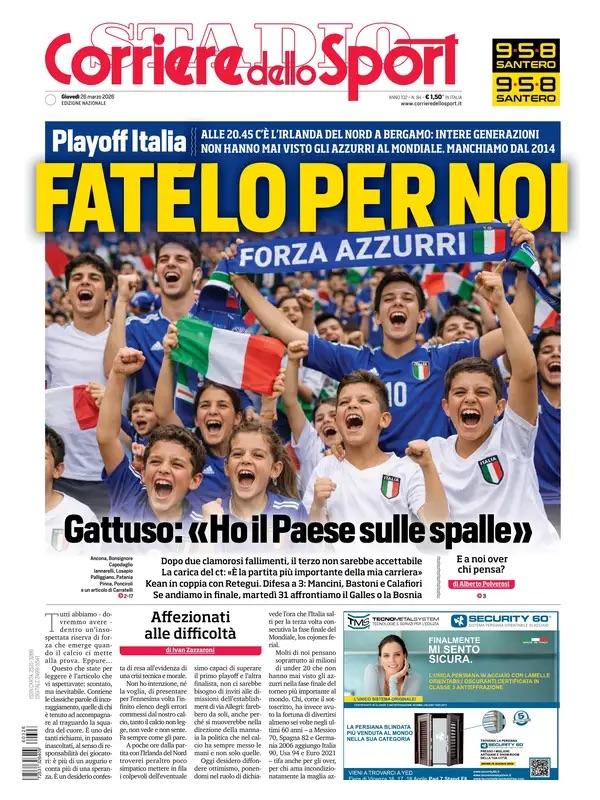 "L'Italia si gioca il Mondiale! Fatelo per noi, Siete l'Italia", le prime pagine del 26 marzo