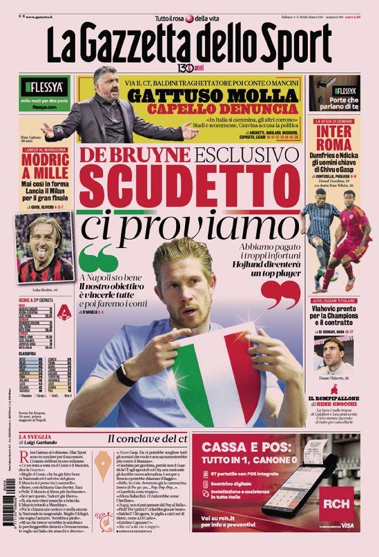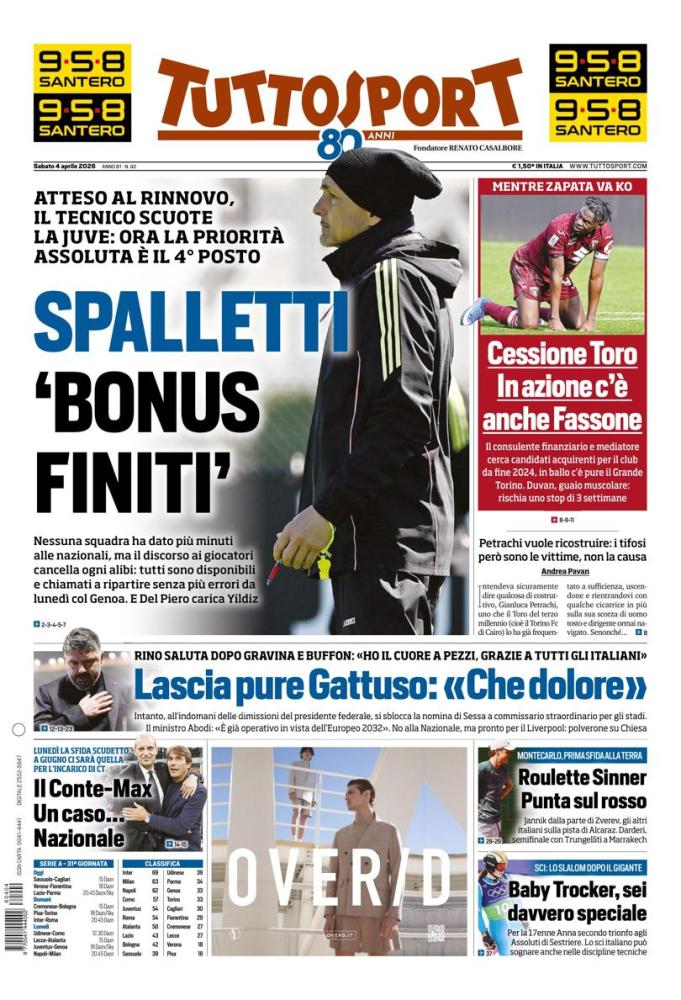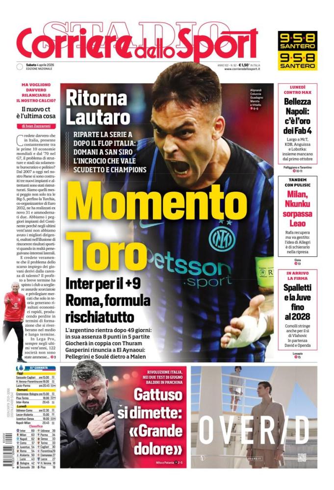Il big match Inter-Roma trova ampio spazio sulle aperture dei quotidiani sportivi in edicola oggi. "Momento Toro" titola il Corriere dello Sport, dedicando la copertina al ritorno in campo del capitano nerazzurro, assente da quasi due mesi. "Inter per il +9, Roma formula rischiatutto", si legge: "L'argentino ritorna dopo 49 giorni, in sua assenza 8 punti in 5 partite. Giocherà in coppia con Thuram. Gasperini rinuncia a El Aynaoui: Pellegrini e Soulé dietro a Malen". La Gazzetta dello Sport si concentra su due dei protagonisti della sfida di San Siro: "Dumfries e Ndicka gli uomini chiave di Chivu e Gasp", scrive la Rosea. Di seguito le prime pagine di sabato 4 aprile.